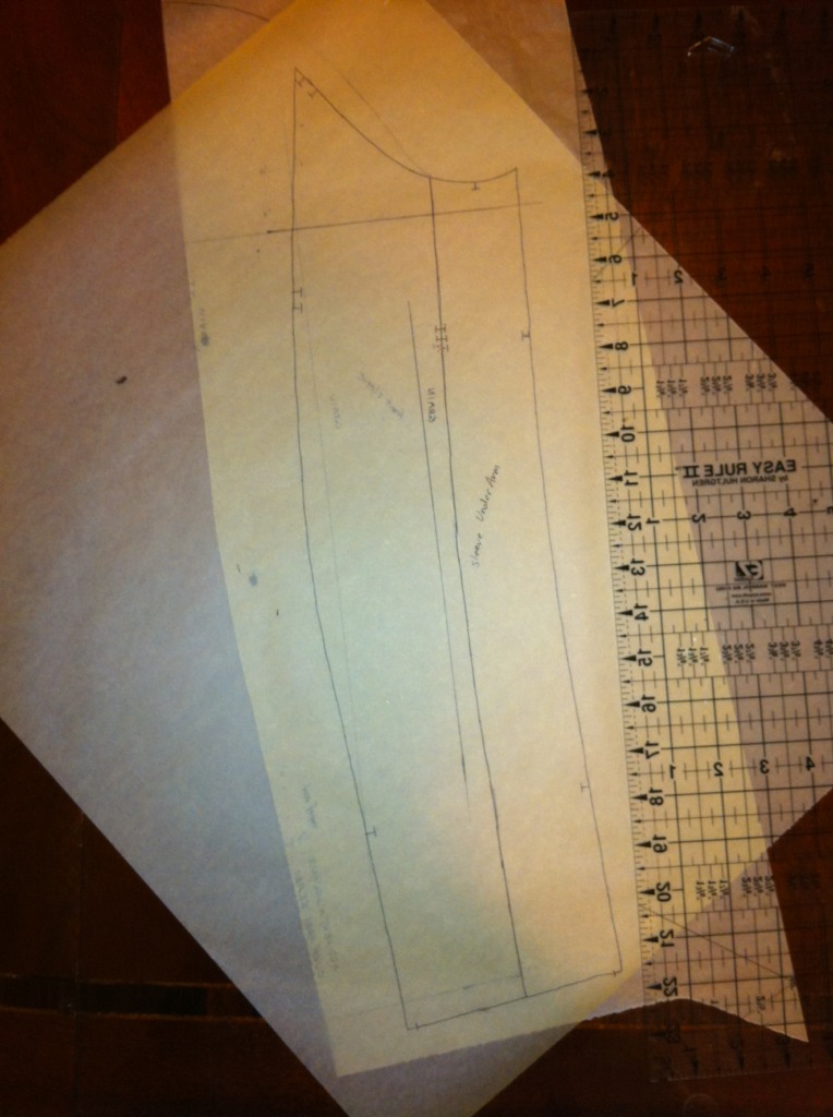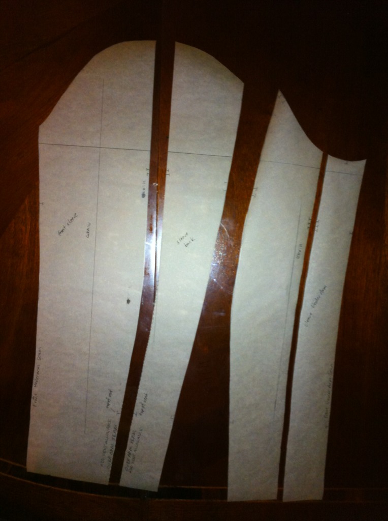 This is where I got stuck. How do I combine the middle two pieces? What happens to the sleeve dart? I am thinking it converts to ease at the underarm seam and the top of the sleeve where it is set in. I think I am going to cut that third piece at the perpendicular line and flip the bottom portion from left to right so that the dart leg becomes the underarm seam when I merge the pieces together.