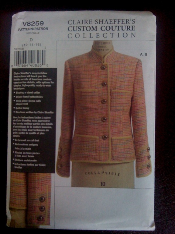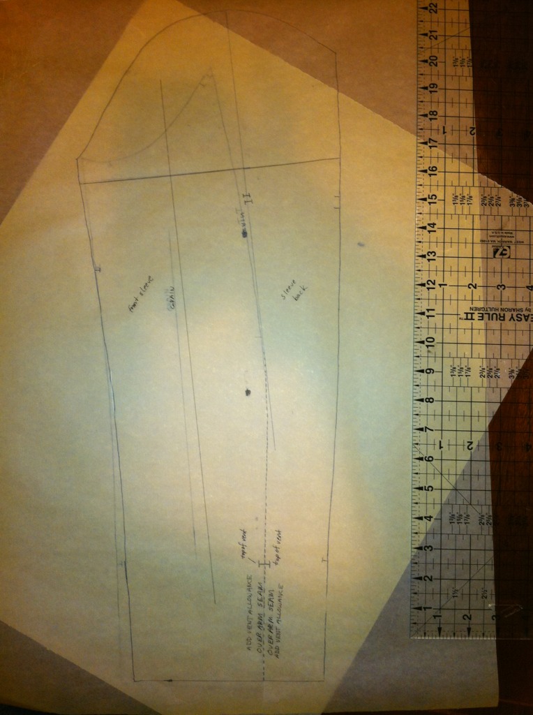 I am pretty sure I want to use a 3 piece sleeve for my Chanel jacket, but the problem is I have a custom drafted two piece sleeve and I am not sure how to convert it to three pieces. I searched my pattern stash, and it turns out, I have Vogue 8529 which has a three piece sleeve. I examined the pieces, and the three seam lines appear to go along the outer arm and about an inch to either side of the underarm. Perfect. Now, I just have to make my two piece draft into a three piece draft.