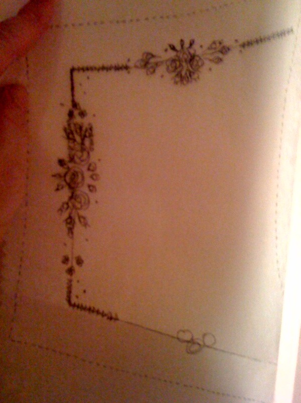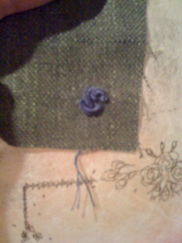 I tried separating the plies of the wool yarn, but there were a couple of problems. First, even a single twisted strand was too thick and the stitching looked sloppy, and second, without the support of the other plies, the fibers would just pull away and the strand kept coming apart. So, I experimented with some of the leftover DMC Medici wool that I used on the blanket and made some sample stitch-outs of the Palestrina stitch that I like so much. It looked a little anemic with one ply, so I tried it with two and I liked it a bit more. I went on line and ordered some Appleton wool in varying shades of purple. In the meantime, I thought it a good idea to practice with some DMC cotton floss to perfect my stitching. As I stitched,I began to wonder why I didn't want to use the floss originally. I think I rememeber making a cross stitch design on a romper for my daughter when she was a baby and the color bled in the wash. Since this dress will be lovingly hand washed in Eucalan, I tested the DMC floss for colorfastness by rinsing a sample in some cold water and setting it by my fireplace to dry. No bleeding - even after I rolled it in white paper towels while it was wet! I did not use the Eucalan, though. I hope it doesn't make a difference. Now that I am typing this, I am thinking I should do a test with the Eucalan just to be safe. I have to say I really like the cotton floss and as luck would have it, I have lots of it, too! I think I am going to use cotton floss instead of wool. It looks really nice and it stitches up like a dream. I took another look through my A to Z book and found a cast on rose that I wanted to play with, so I practiced it a bit. Then I began to doodle on a trace out of the pattern piece and I came up with a design for the embroidery that I think satisfies me.