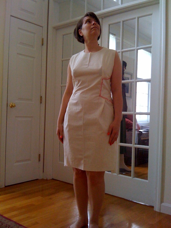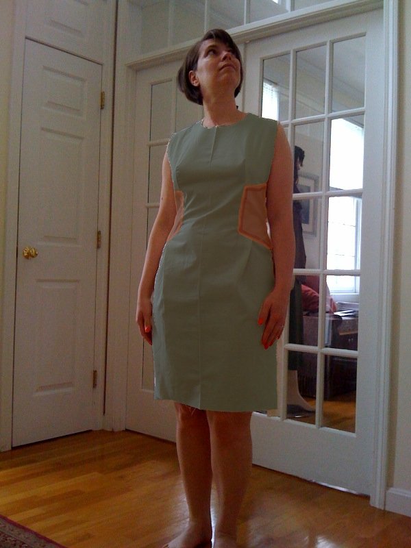 So the next decision I have to make is whether or not to use a different color for the side panels. Here I played with GIMP and added color to my muslin. I am leaning toward using the same color and having only the embroidery to call attention to the side panels. What do you think? Color block - Yay or Nay?