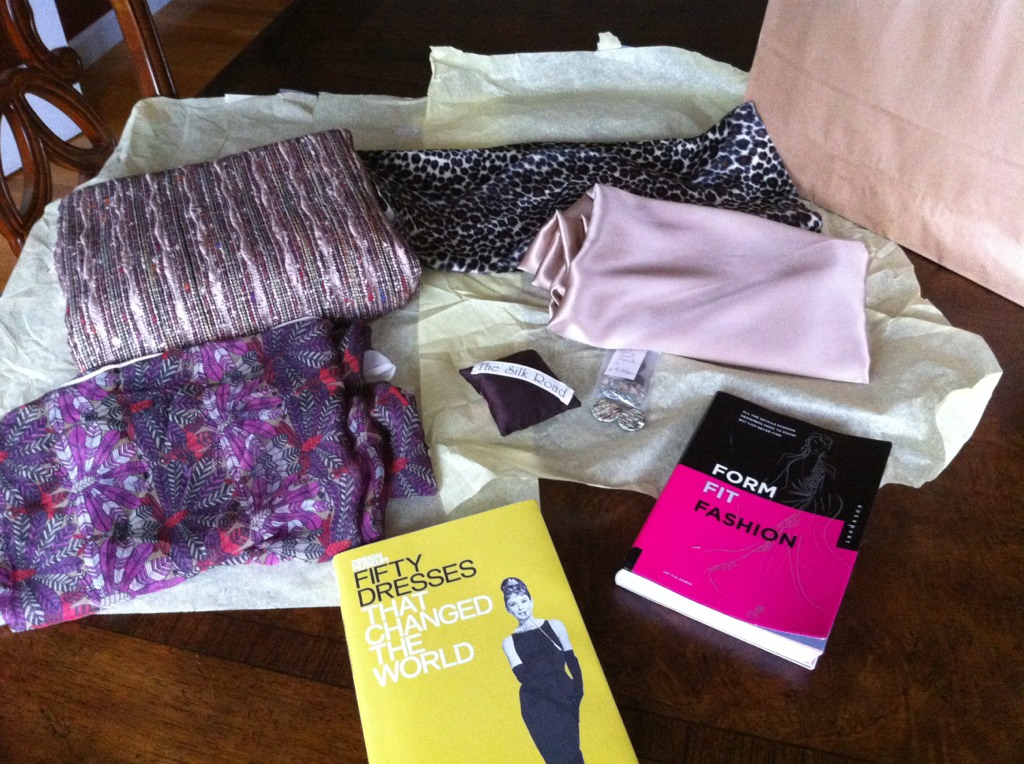 The Kenneth King events were quite enough excitement for me over the weekend, but there is more!! A new fabric store opened called Silk Road. I think I have heard of them before. The name sounds familiar. I went to the grand opening and BOY did I love it there! It is just lovely. Everywhere I looked, I found treasure. The fabrics were luxurious, yet reasonably priced. I bought two and a half yards of a fabulous Linton tweed with sequins sewn on both sides, two yards of silk charmeuse, a yard of printed silk georgette, and a half yard of this wonderful cheetah print faux fur. I also could not leave without six beautiful one inch shell shank buttons, and two more books for my collection. They served punch and mini cupcakes, and I saw a few familiar faces as I browsed. All in all, I had a wonderful weekend. What should I make with my fabulous new fabrics?