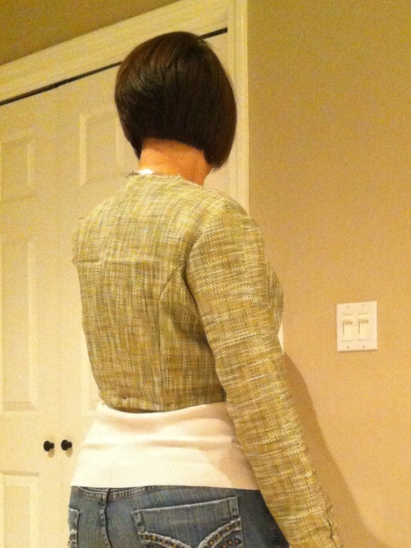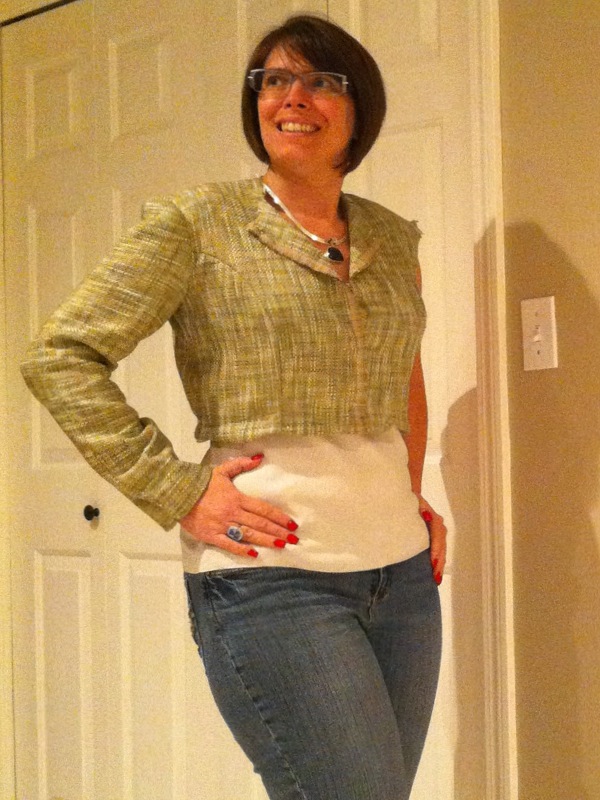 I know I am supposed to put BOTH sleeves in and have a look, but I got so excited after just one, I had to post pictures! Look how nicely it fits!!! If you click to expand the pictures, you will see I have pinned the sleeve vent shut. I can get my hand through the sleeve without opening the vent. I think I am going to make it tighter at the wrist and possibly all the way up to the shoulder. I have other alterations in mind as I morph this Bernina My Label jacket pattern into a cropped Chanel. I'll take pictures as I go and keep you posted. Here is a kind of before and after to whet your appetite.