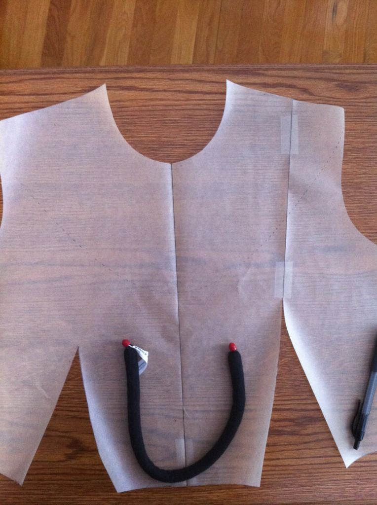 Here, I taped the fronts together and redrew the opening. I am not convinced I like it as much as my original idea with the wider neckline. Also, that diagonal line I had in my mind for the zipper is not going to work out. I think I need to let this marinate a little before I cut any fabric... I may redo it and go with my