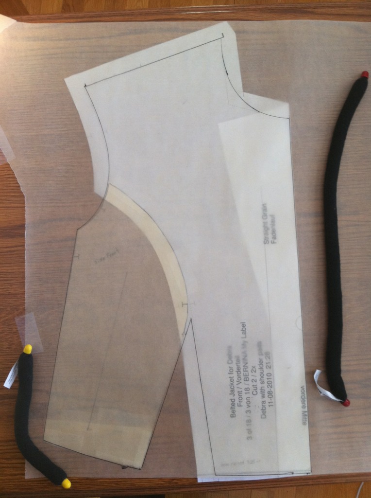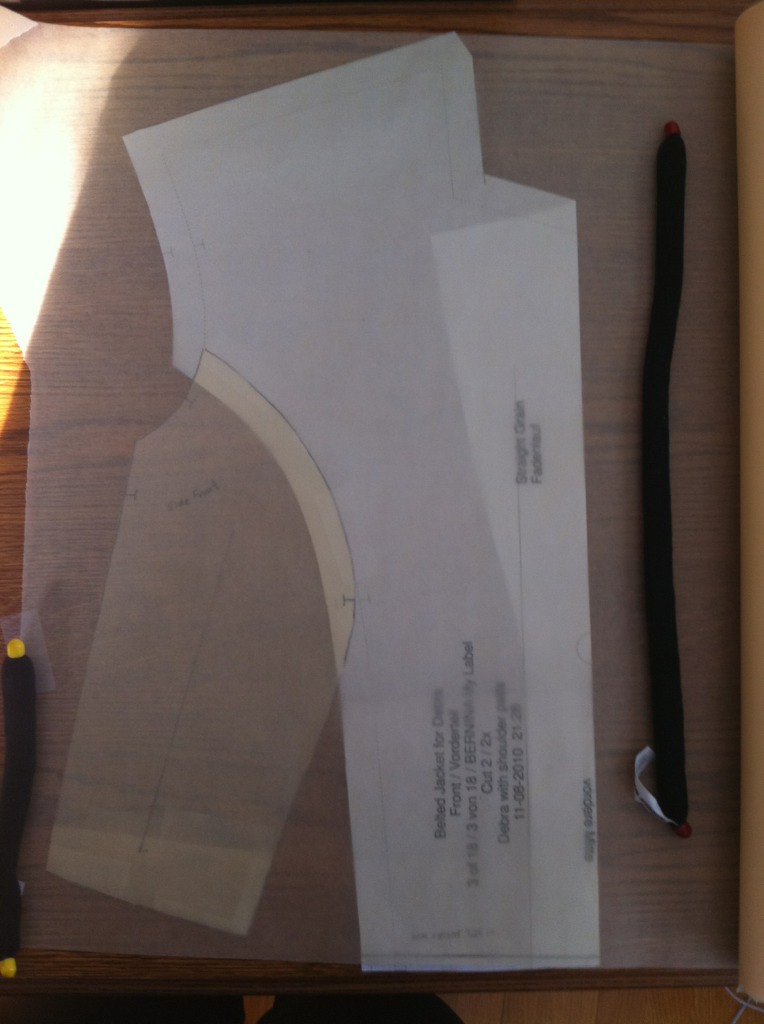 I began with the BML belted jacket pattern which I used for this jacket. I cropped the pattern at the waist and taped the side front to the front along the upper part of the princess seam. Then I covered the pieces with tracing paper.