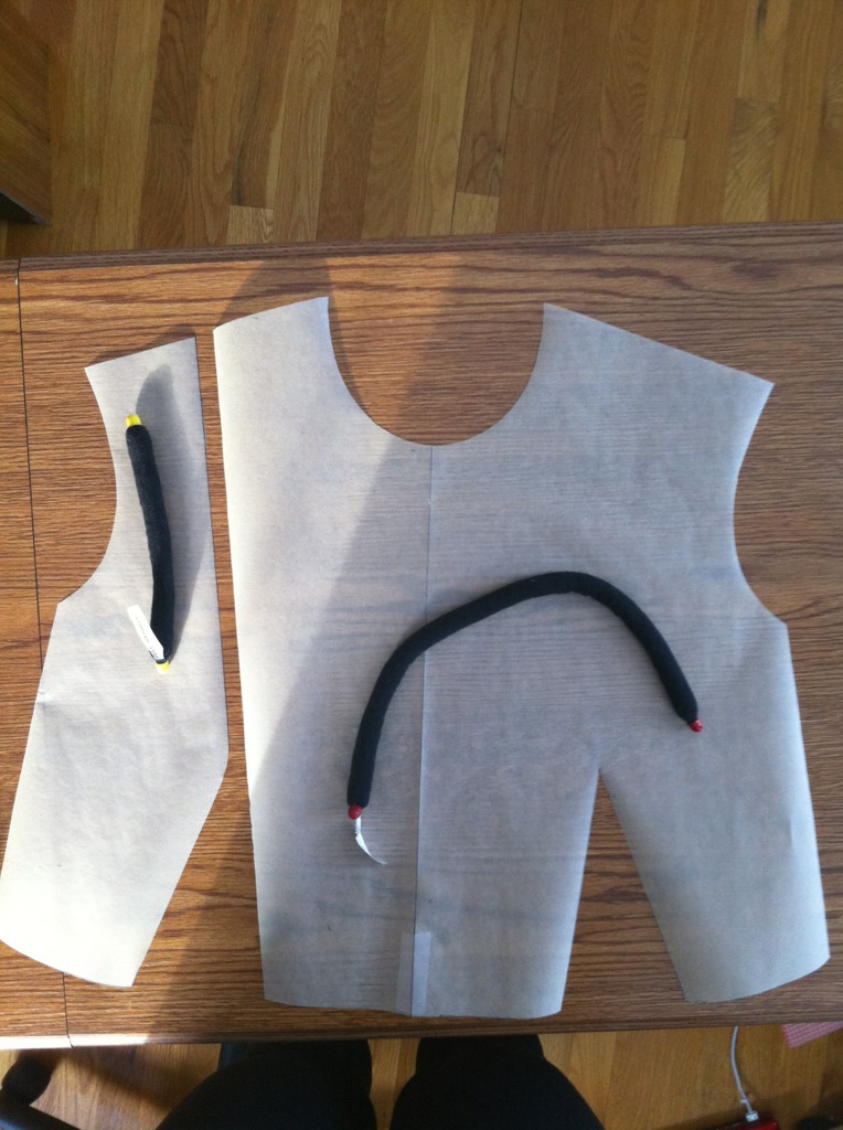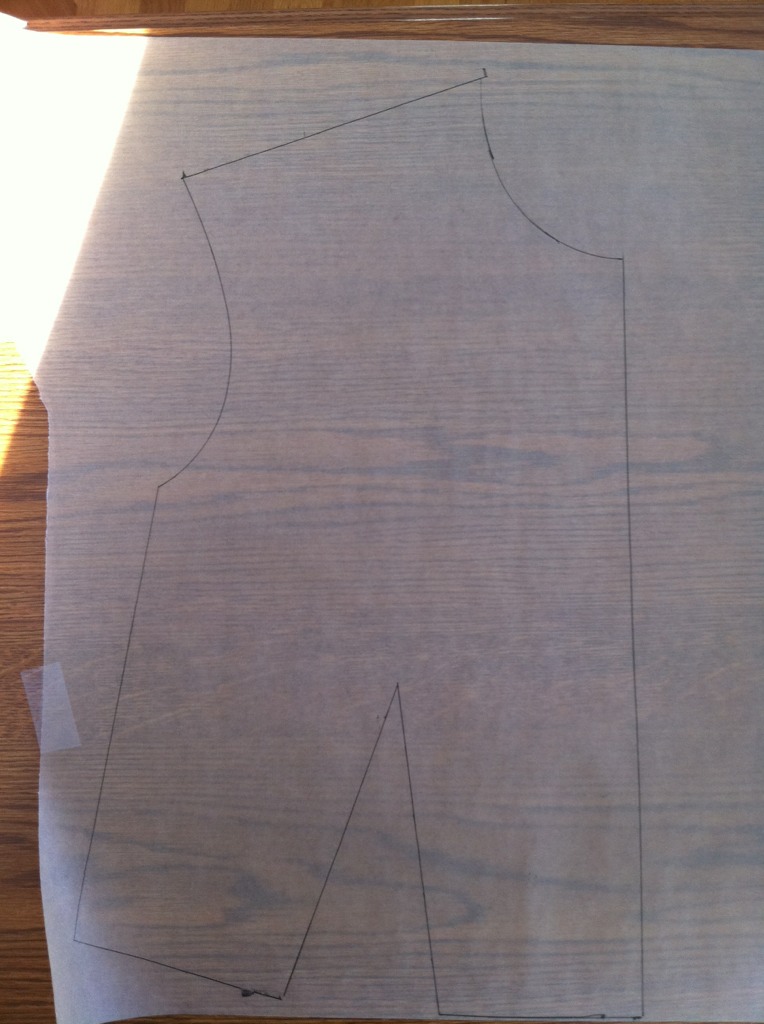Here, I taped the fronts together and redrew the opening. I am not convinced I like it as much as my original idea with the wider neckline. Also, that diagonal line I had in my mind for the zipper is not going to work out. I think I need to let this marinate a little before I cut any fabric... I may redo it and go with my original sketch.