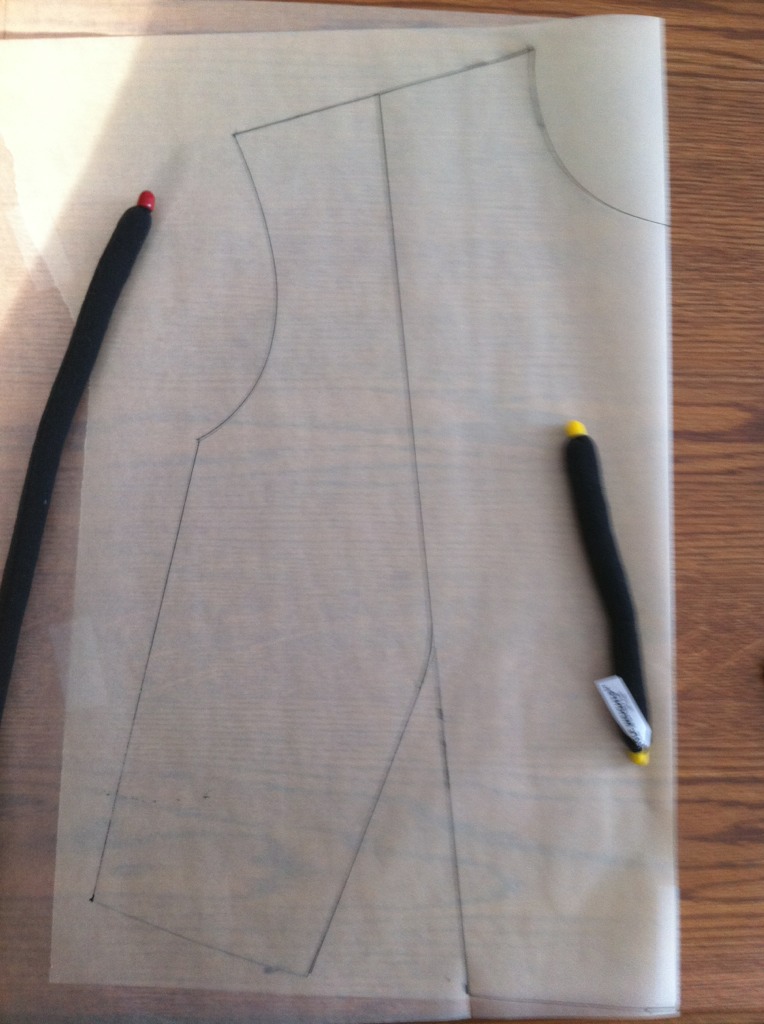 I traced the two pieces as one, converting the princess seam to a waist dart. I also redrew the neckline, using my french curve. For this pattern, I omitted the seam allowances. I find it easier to work with patterns when there are no seam allowances. I will add the seam allowances when I cut the fabric.