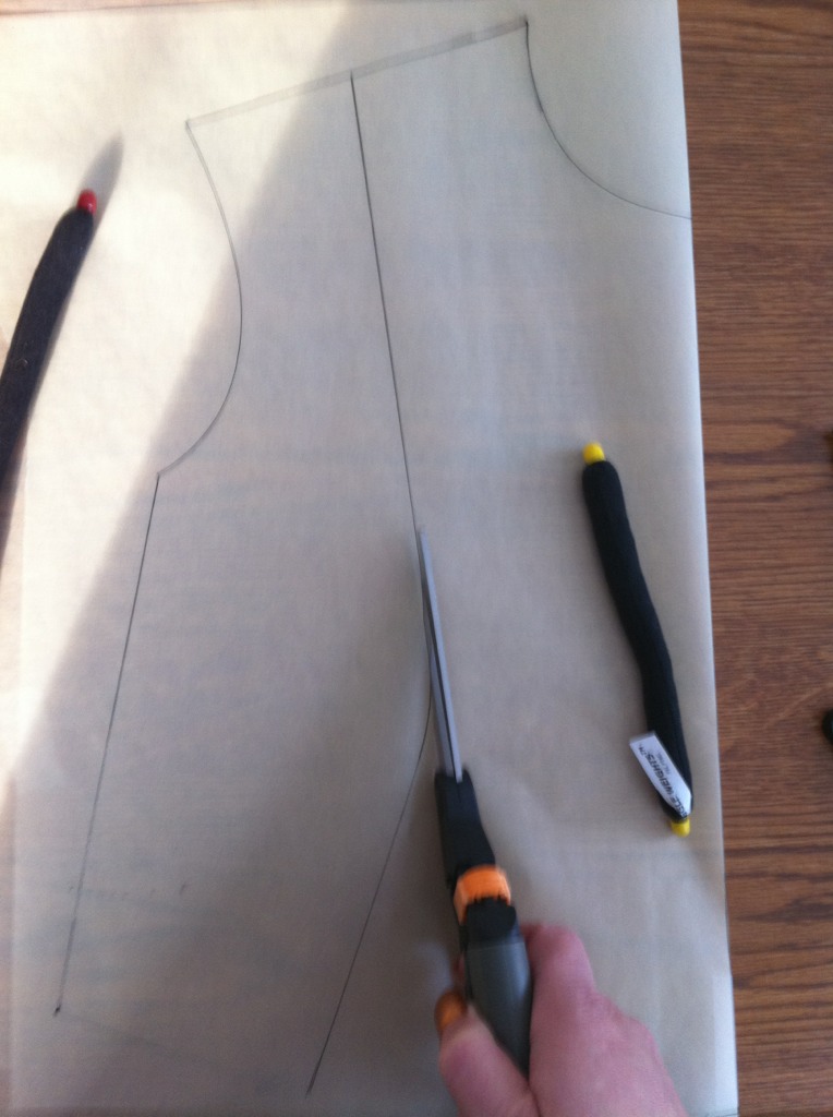 Next, I cut the new pattern pieces out, cutting the left and right apart along the dart leg and its extension.
